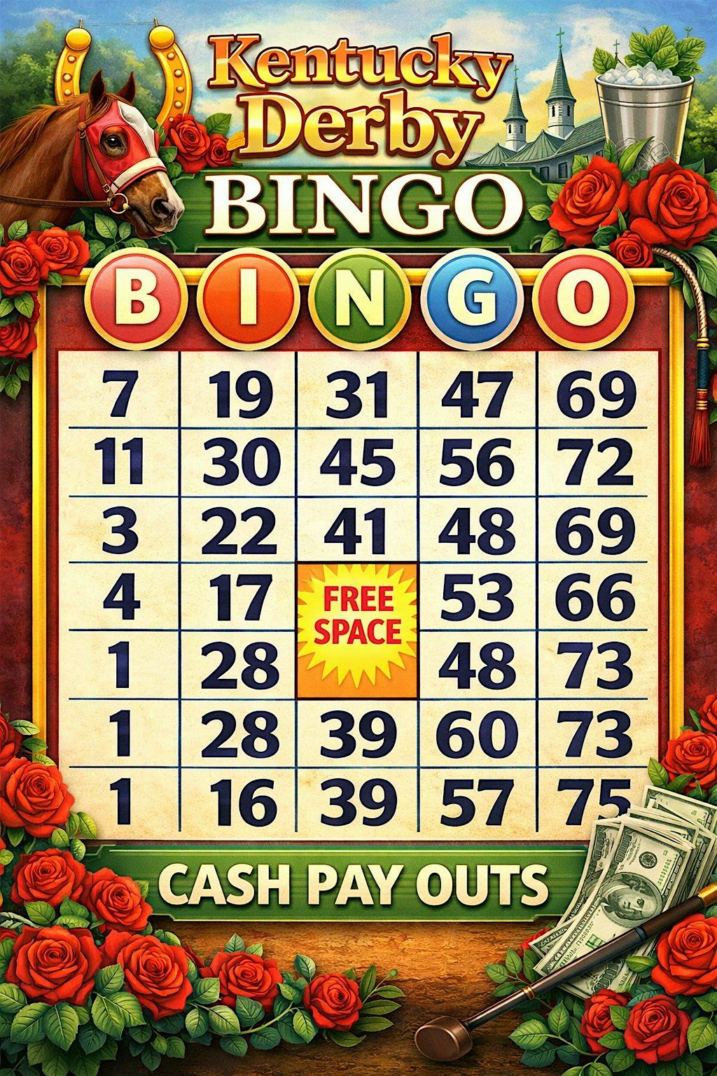 Get ready for a fun-filled day with Kentucky Derby BINGO! Join us in person for an exciting blend of the classic derby vibes and everyone's favorite bingo game. Whether you're a bingo champ or just looking to have a blast, this event promises laughs, thrills, and great company. Don your favorite derby hat, grab your lucky charm, and let's make some memories together!