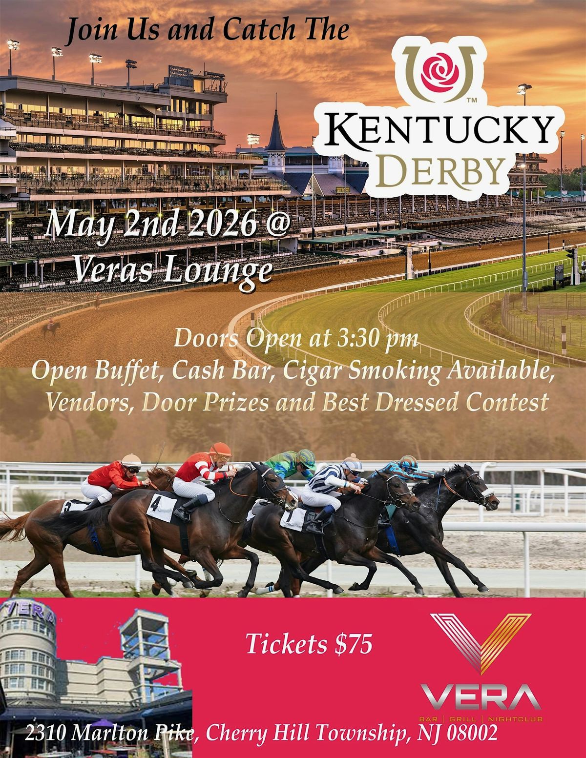 Join us for an event at VERA's lounge for an open food buffet, cash bar, vendors, door prizes, and a best dressed contest! We will be showing the races!