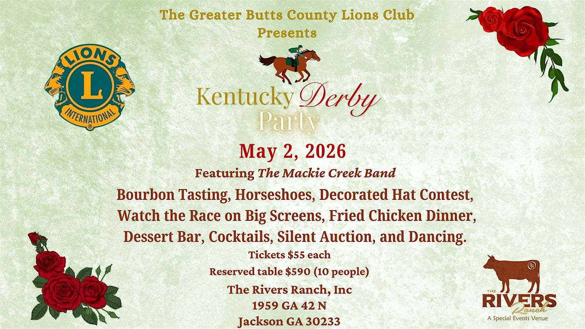 Welcome to the Kentucky Derby Party at The Rivers Ranch, Inc! Get ready to experience the excitement of the most famous horse race in style. Put on your best hat and join us for a day filled with fun, food, and of course, horse racing. Whether you're a die-hard fan or just looking for a good time, this event is perfect for everyone. So grab your friends and come on down to The Rivers Ranch, Inc for a day you won't forget! Join us May 2, 2026 for our Kentucky Derby Party. Bourbon Tasting, Horseshoes, Decorated hat contest. Watch the race on the Big screens, fried chicken dinner, dessert bar, cocktails, raffles, and dancing to The Mackie Creek Bank. All proceeds benefit The Greater Butts County Lions Club.