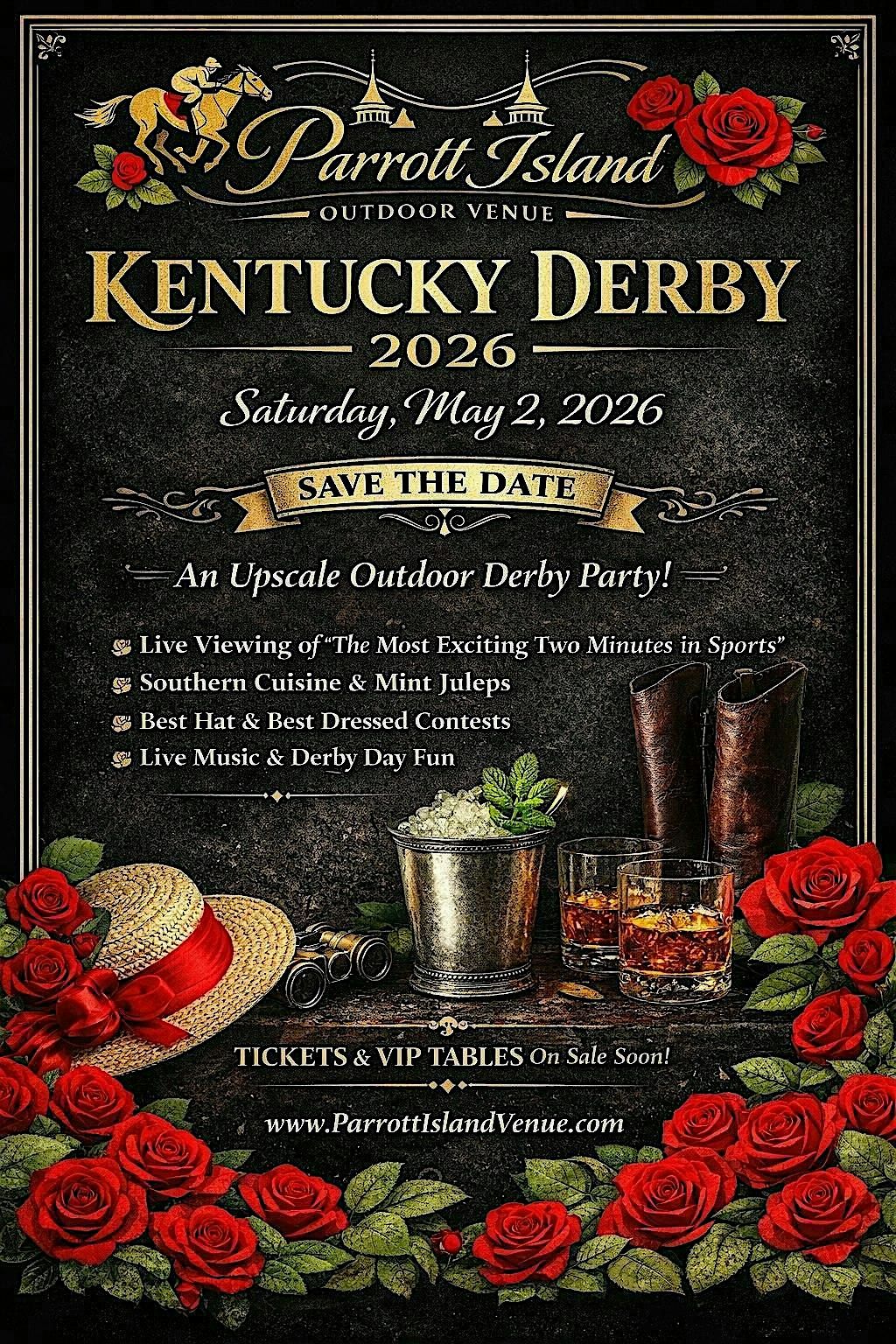 Get ready for a fun-filled evening at the Parrott Island Outdoor Venue for our Kentucky Derby Watch Party! Join us on May 2, 2026 at 5:00 PM (Eastern Time) to watch the most exciting two minutes in sports.