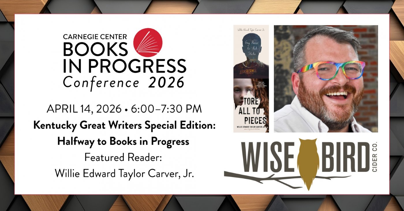 Join us at Wisebird Cider Co on April 14th from 6-7:30pm for a special edition of our Kentucky Great Writers series celebrating the Carnegie Center's upcoming Books In Progress conference with featured reader Willie Edward Taylor Carver, Jr