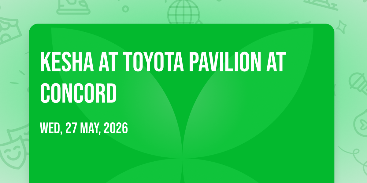 π Prepare to be amazed at Kesha at Toyota Pavilion at Concord, the most anticipated gathering of the season! π Set against the stunning backdrop of Toyota Pavilion at Concord in vibrant Concord, CA, this event promises to redefine your expectations. π Mark your calendars for May 27th, 2026 at 07:00 PM and get ready to immerse yourself in an atmosphere of wonder and excitement. β¨ From the moment you arrive, you'll be transported into a world where memories are made and stories come alive. They have crafted an experience that perfectly harmonizes entertainment, innovation, and community spirit. π Join us as we create moments that will be discussed for years!