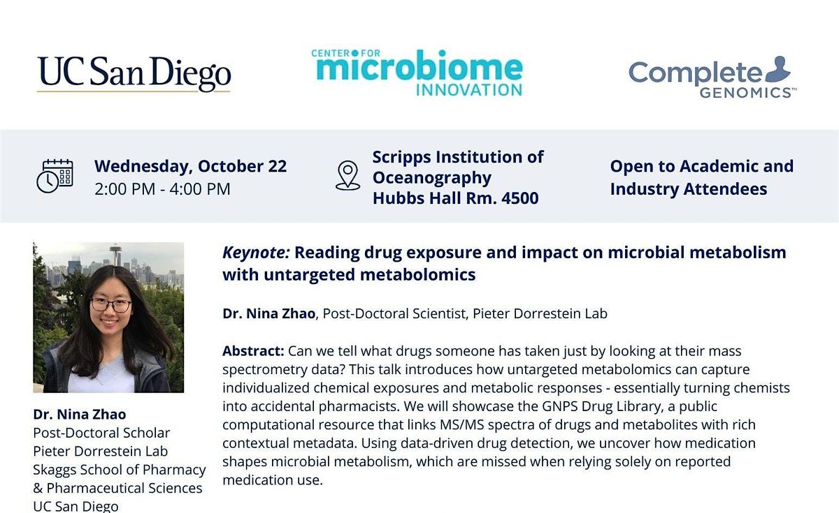 For the next installment of our collaborative seminar series with Center for Microbiome Innovation, we're excited to feature a Keynote Presentation from Dr. Nina Zhao, Post-Doctoral Scientist in the Pieter Dorrestein Lab at UC San Diego, as she presents her work on how untargeted metabolomics reveals the relationship between drug exposure and microbial metabolism.