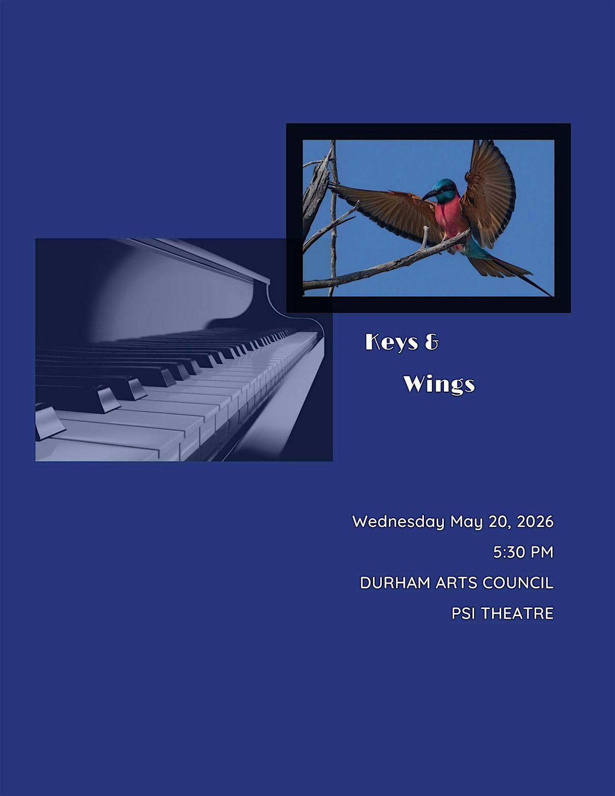 There will be a reception from 5:30 pm in the Semans Gallery of the Durham Arts Council where Jake Hillygus' photographs will be showcased, and seating for the recital in the PSI Theater will begin at 6:30 pm.