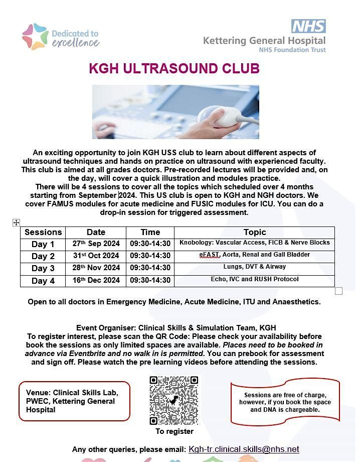 This is an exciting opportunity to join KGH USS club to learn about different aspects of ultrasound techniques and hands on practice on ultrasound with experienced faculty. This club is aimed at all grades doctors. Pre-recorded lectures will be provided and, on the day, will cover a quick illustration and modules practice.