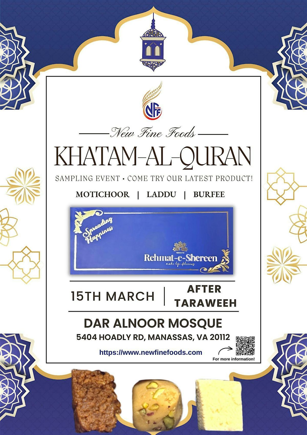 New Fine Foods will be giving out assorted sweets in a Rehmat-e-Sheeren giftbox after Taraweeh Khatam al-Quran, as we approach the end of the holy month of Ramadan. Come find us at our table at Dar Alnoor Mosque. ✨
