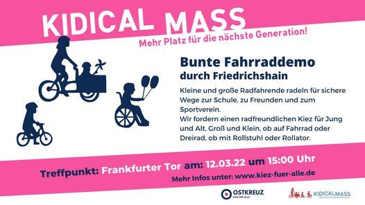 Bunte Fahrraddemo durch Friedrichshain - Kleine und große Radfahrende radeln für sichere Wege zur Schule, zu Freunden und zum Sportverein.Wir fordern einen radfreundlichen Kiez für Jung und Alt, Groß und Klein, ob auf Fahrrad oder Dreirad, ob mit Rollstuhl oder Rollator.