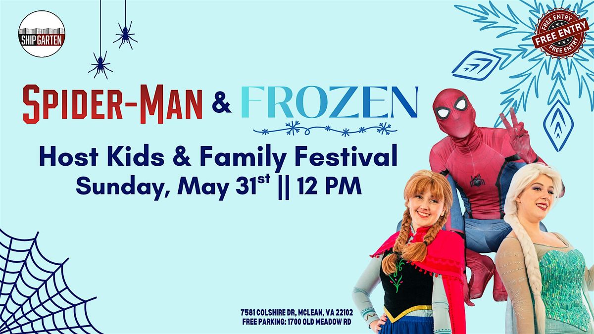 Join us at **Shipgarten’s Kids & Family Festival** on **Sunday 5/31** for a magical day featuring special appearances by **Frozen’s favorite snow queen & princess** and everyone’s favorite web-slinging hero, **Spiderman**! 👑✨