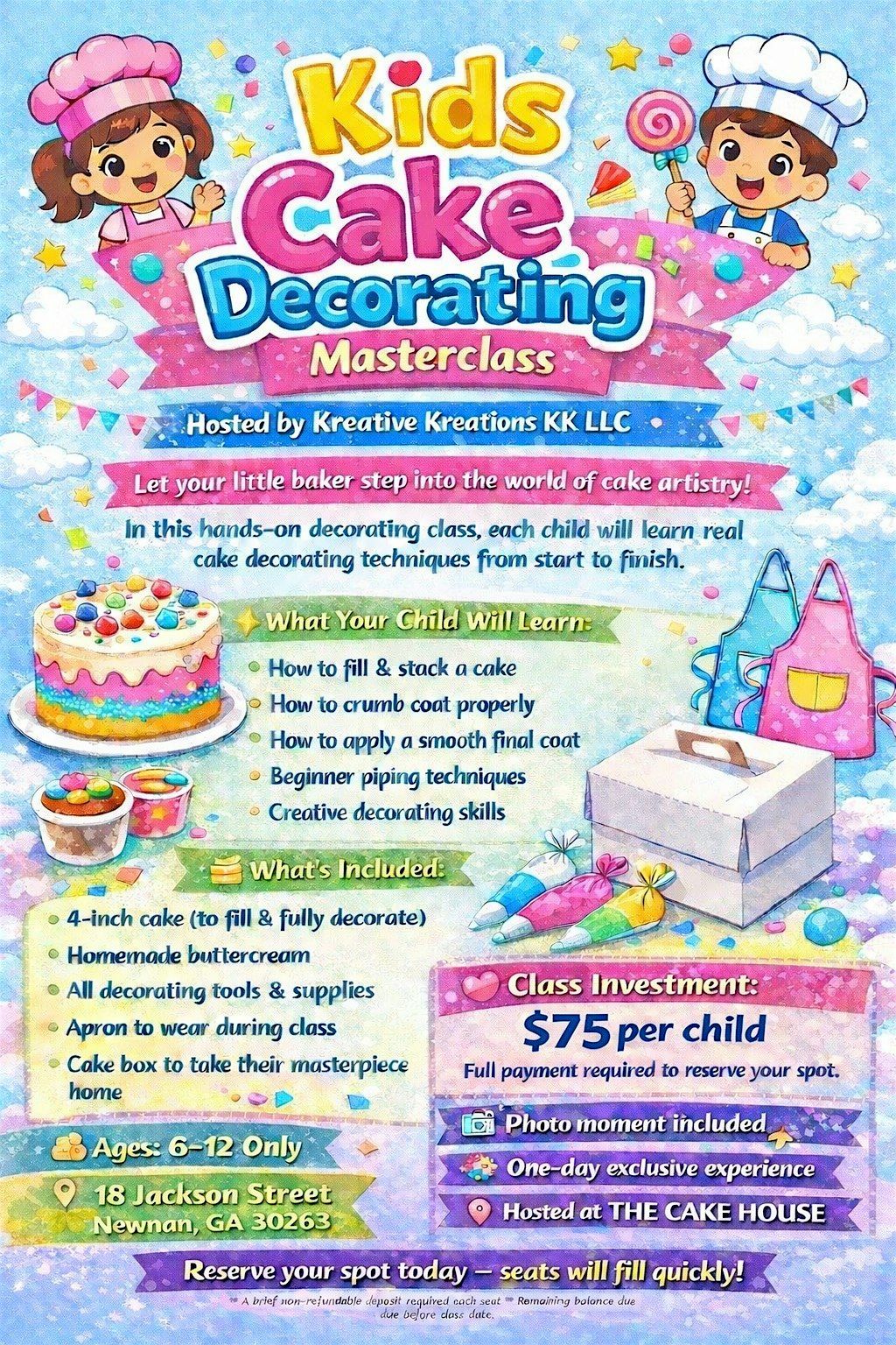 Hey parents! Bring your little bakers to our super fun Kids Cake Decorating Class. This hands-on event is perfect for kids who love to be creative and get a little messy. They'll learn cool decorating tricks, use colorful icing, and take home a cake they've made themselves! All in person, with lots of smiles and sweet memories. Let's make some magic in the kitchen!