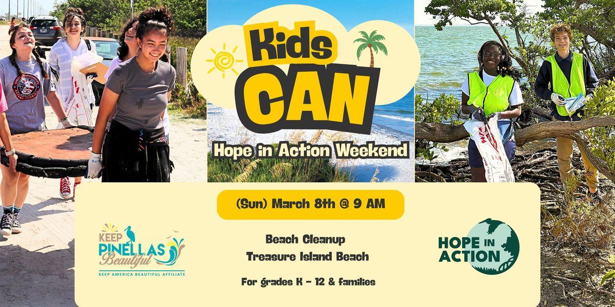 Join Keep Pinellas Beautiful in partnership with Roots and Shoots Tampa Bay, City of Treasure Island, and Treasure Island Adopt-A-Beach for Hope In Action 2026! As part of the Environmental Action Days, we will be hosting a cleanup on Sunday, March 8th at Treasure Island Beach.