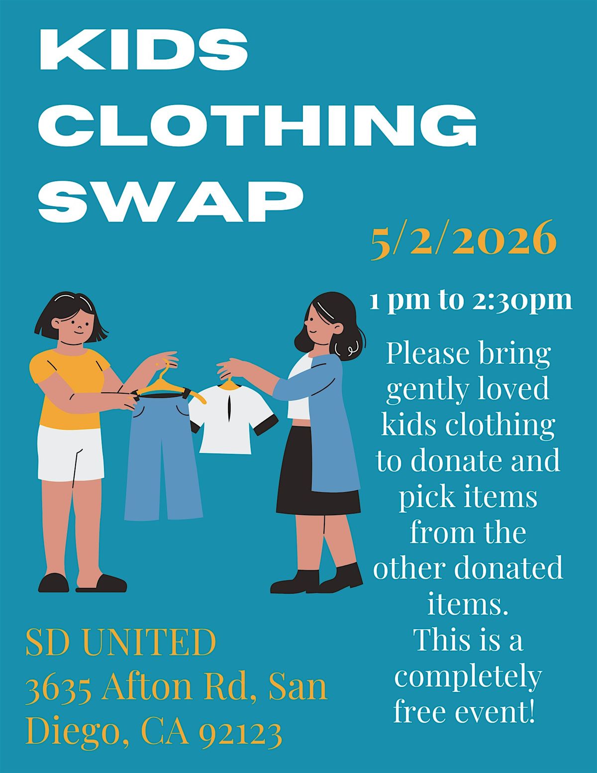 A kids clothing swap is a community-driven event where families bring gently used children’s clothing to donate and share with others. Participants can browse through a variety of donated items to find what their kids need—making it an easy, affordable, and sustainable way to refresh wardrobes. Any remaining clothing at the end of the event will be donated to Sharia’s Closet to continue supporting local families in need.