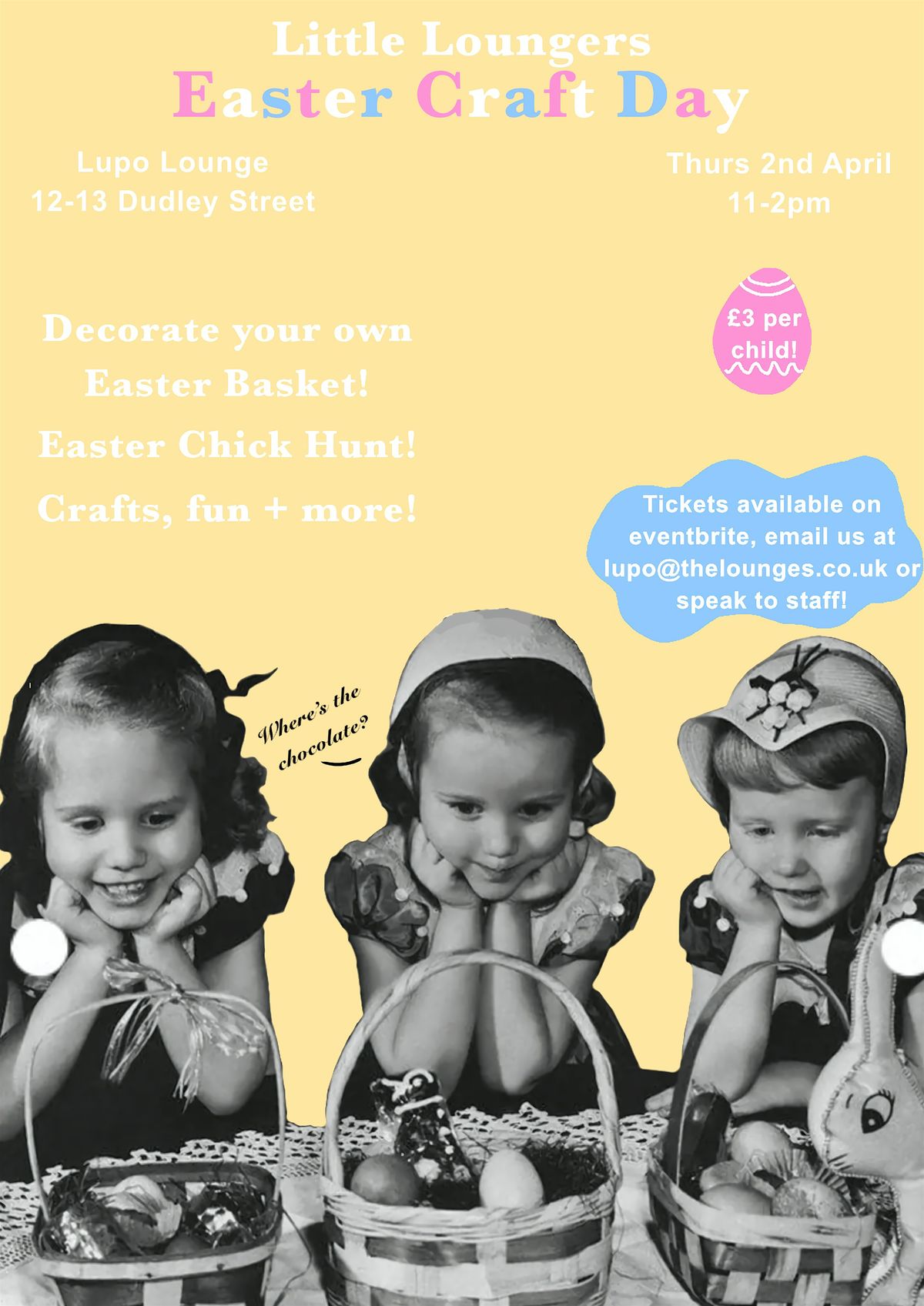 Need a way to entertain the little ones this easter half term? Suitable for big and little kids, our Easter Craft Day is perfect to let little ones get creative decorating their own easter baskets. With all materials provided, let your little loungers creative vibes flow, whilst the big adults relax in the art-deco cafe-bar Lupo Lounge.