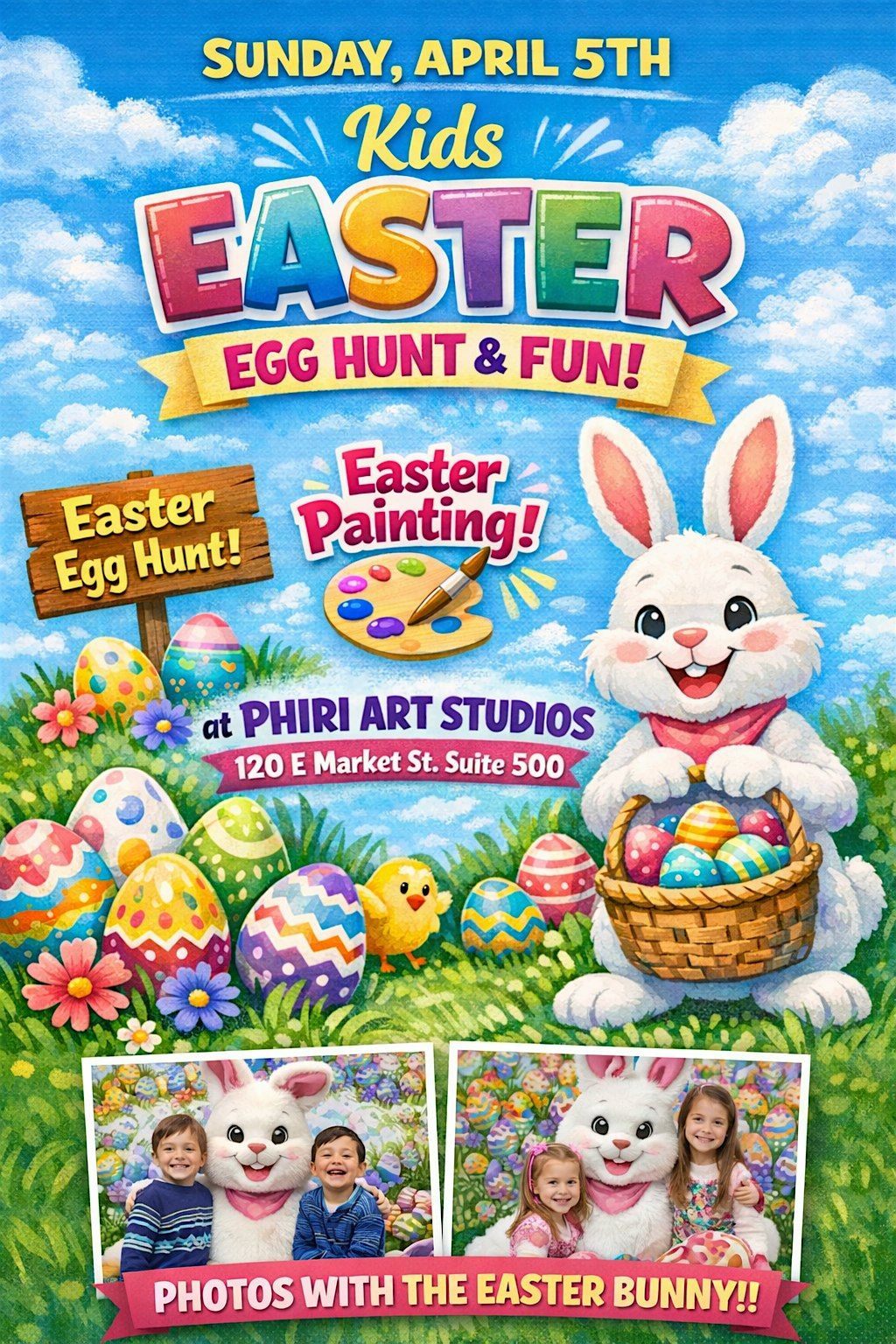 Hop into Easter at Phiri Art Studios! Enjoy a Kids Easter Egg Hunt, egg & canvas painting, and a photoshoot with the Easter Bunny. Two session times available. Free downtown parking included. Bring the whole family for a memorable holiday celebration!