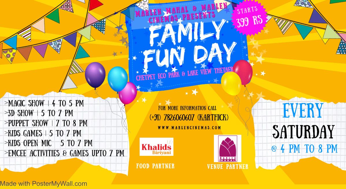 FAMILY DAY OUT ITENERY: 4 PM till 8 PM EVERY SATURDAYAssemble @MarlenMahal in CHetpet Eco Park @3:30 PM - 1- Magic Show 4 PM to 5 PM | 2- 3D Show - 5 PM to 7 PM | 3- KIDS GAMES - 5 PM to 7 PM | a- Igloo house | b- Baloon Shooting | c- Kids Car & Bike | d- Trampoline | e- Few other games too | 4- Monkey Clown's Puppet show - 7 PM to 8 PM | | 5- KIDS OPEN MIC EVENT- 5 PM till 7 PM - Poetry, Singing, Music instrument, Comedy ,Dance| 6 - EMCEE Events & games for Kids & AdultsFAMILY FUNDAY FULL PACKAGE TICKETS: RS 499 - 4 PM till 8 PM full accessKIDS SPL 399 : 4 PM till 8 PM you can watch Magic Show , Puppet show ,3D show, KIds games .ADults 299 : 4 PM till 8 PM you can watch Magic Show , Puppet show ,3D show.ADults Entry Alone : 4 PM till 8 PM you can accompany kids to guide them for all shows.KIDS OPEN MIC Performer 149 RS - 5 PM till 7 PM - You can perform for 5 mins on stageAccompanying Person 99 RS - 5 PM till 7 PM - Parent/Sibling/Guardian accompanying can take this ticketsVenue Details:Chetpet Eco Park and Lake View Theater in Chetpet Eco ParkFor Tickets & Queries :For queries pls call the number in poster(Karthick)For details visit www.marlencinemas.comOther Events in Chetpet Eco Park , Every Saturday : KIDS GAMES (5 PM to 7 PM): www.marlencinemas.com Magic show (4 PM till 5 PM) : www.marlencinemas.com Lake View THeater MOvie (8 PM till 11 PM): www.marlencinemas.com About Venue: Event happens inside chetpet eco parkChetpet Eco park is a 16 acre lake and games amentities venue equipped with1- 3D theater2- Open Air Theater3- VR & AR & Doom Theater4- Boating Facility5- Fishing activities6- Kids snacks counter7- 2 lakes8- AquariumFor event details pls callthe num in the poster .Kids Games and pary 2024 starts at 5 pm and end at 7:30 pm -You have access to 3D theater and Open air theater were these activities will happen.You can play1- 3D Show , 2 - Kids car , 3-igloo house , 4- trampoline , 5 - catch the stick 6- boatingTo know about more event in this venue pls click www.marlencinemas.com