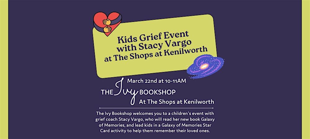 The Ivy Bookshop at The Shops at Kenilworth welcomes you to a children's event with grief coach Stacy Vargo, who will read her new book Galaxy of Memories, and lead kids in a Galaxy of Memories Star Card activity to help them remember their loved ones.