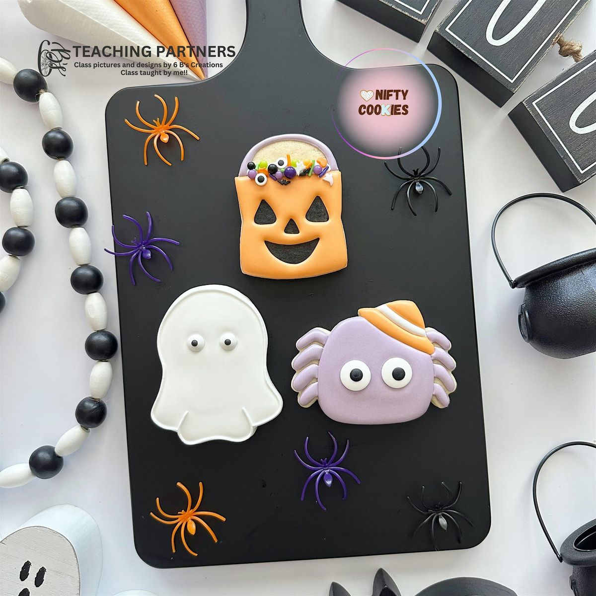In this fun and beginner-friendly Halloween cookie decorating class. In this 1 hour class, created by 6B's Teaching Partners and taught by Nifty Cookies, we'll cover the basics of sugar cookies (so – yes, it’s beginner-friendly!).