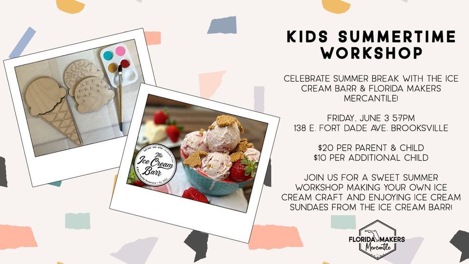 Join Florida Makers Mercantile & The Ice Cream Barr as we celebrate the start of Summer! Workshop includes an ice cream craft, all necessary supplies, and sundaes provided by The Ice Cream Barr! $20 per adult/child pair, $10 per additional child.