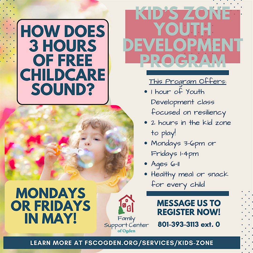 - 1 hour of youth development and 2 hours in Kid's Zone = 3 hours break for you!