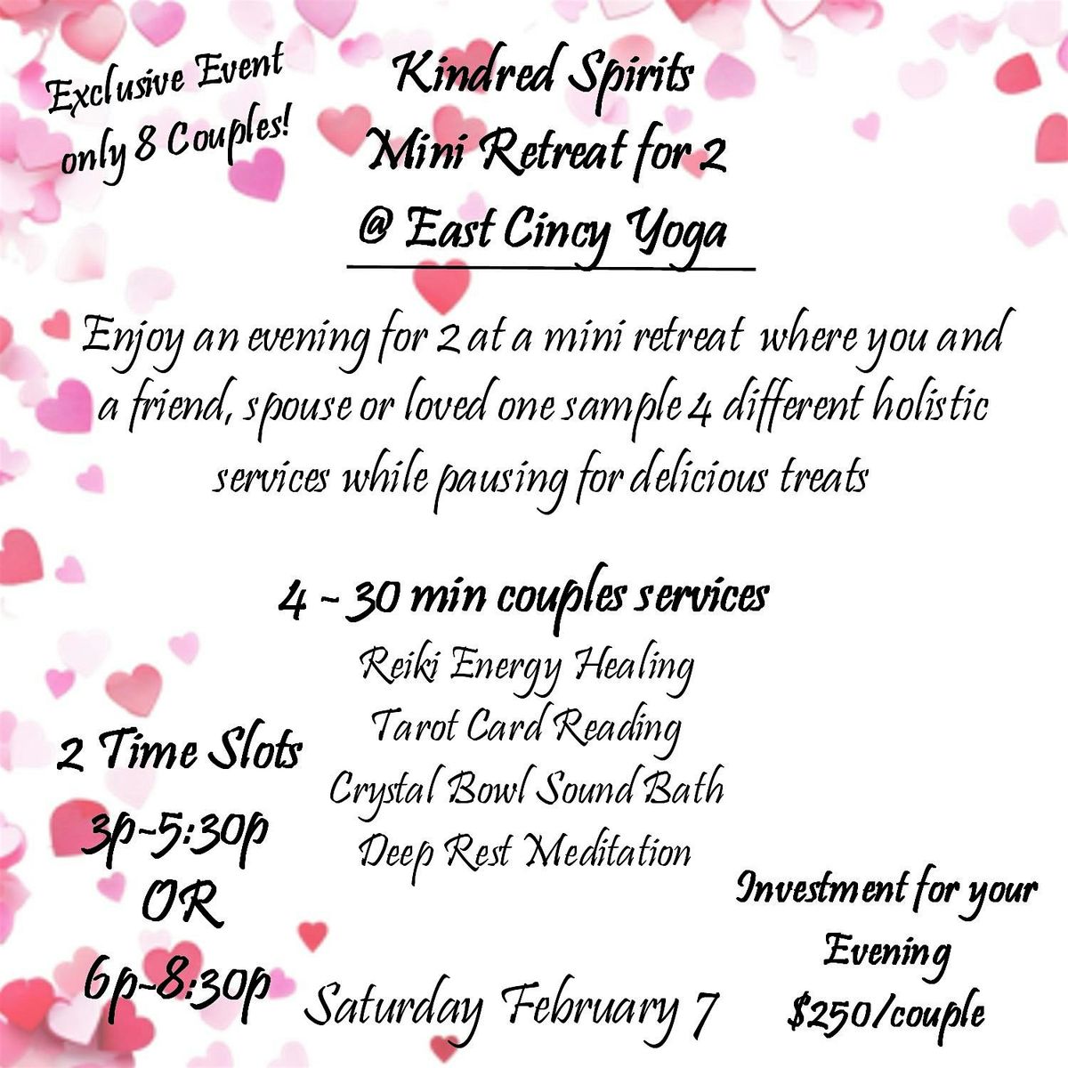 Looking for a cozy, in-person getaway to celebrate love and friendship? Join us at the Kindred Spirits Valentines Retreat for 2! It’s all about good vibes, sweet moments, and making memories with your special someone. Think relaxing activities, heartfelt connections, and a chance to unwind together. Perfect for couples wanting to escape the everyday and soak up the romance or the gal pals wanting a chance to hang out! Don’t miss out on this unique chance to celebrate your bond in a warm, inviting setting!