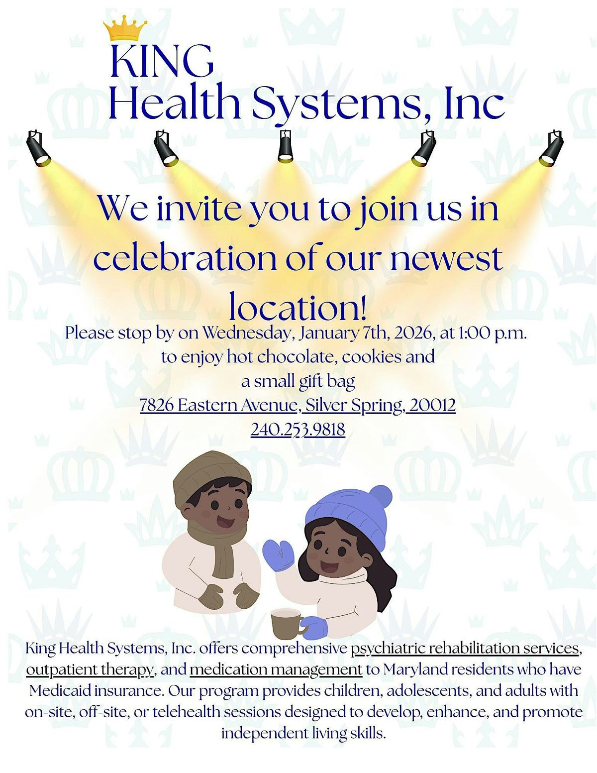 Hey everyone! Come join us for the exciting grand opening of King Health Systems right here in Silver Spring, MD. It's an awesome chance to connect and get a taste of what we’re all about. This is an in-person event, so swing by for good vibes and great company. Can’t wait to see you there!
