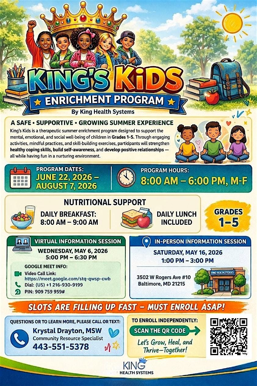 Join us for an exciting, in-person event all about getting acquainted with King Health Systems and learning about our inaugural King's Kids Enrichment Program for the summer! This program will be a great chance for kids to grow, explore, and connect in a friendly environment. Don't miss out on the awesome activities and new connections waiting for you and your children. Come be a part of the King Health Systems family and let’s make some unforgettable memories together!