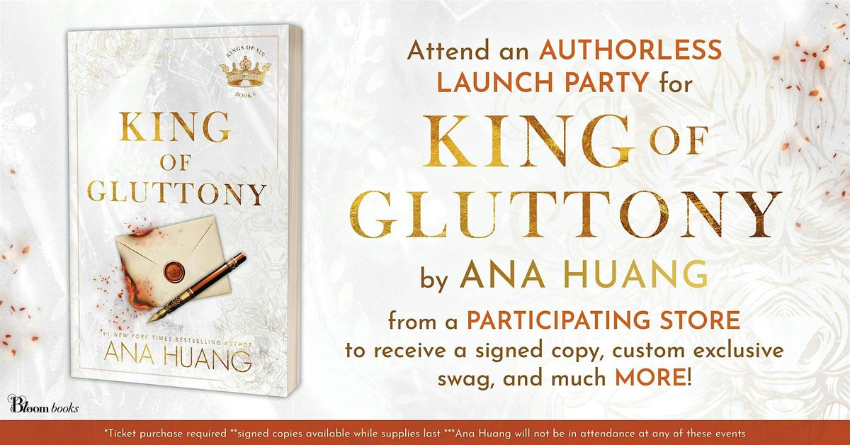 Grab a ticket to the KING OF GLUTTONY release party for a night of fun! Every ticket comes with a SIGNED copy of King of Gluttony, and an evening full of special activities, swag, and more for those in attendance. Additionally, there will be a giveaway to win a CUSTOM apron and a PR EDITION of King of Gluttony (one winner per store). Hurry before spots sell out! (please note: Ana Huang will not be in attendance at these release parties)