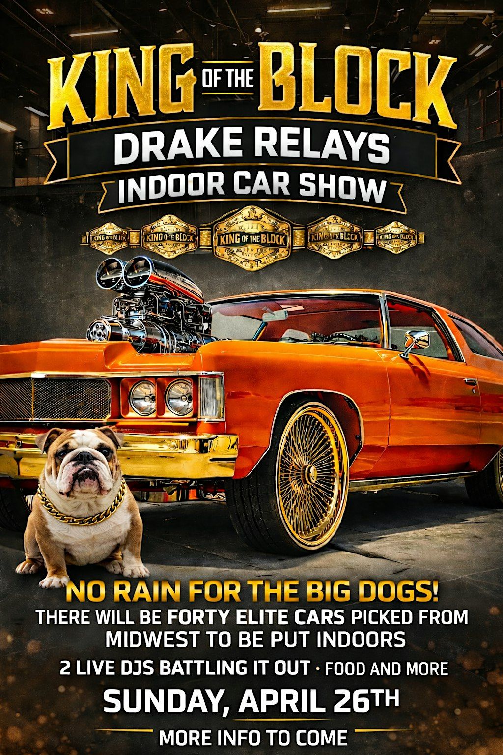 40 of the top Midwest cars competing for king of the block 2 live djs battling out 10 merchandise vendors 4 food trucks DRAKE RELAYS WEEKEND