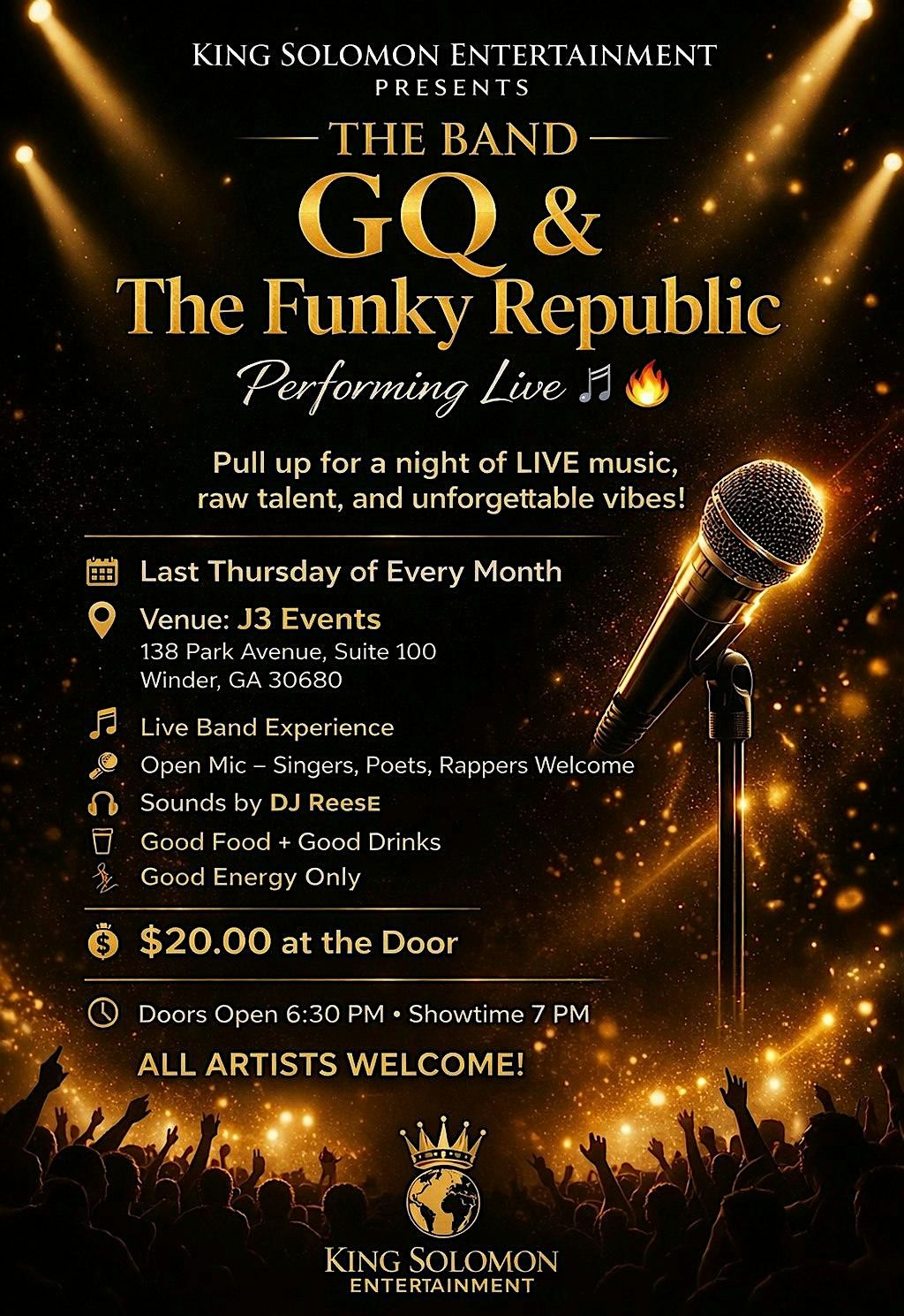 Get ready for an unforgettable night with GQ & The Funky Republic live at J3 EVENTS! Join us on April 23, 2026 at 7:00 PM (Eastern Time) for some funky grooves and good vibes. Don’t miss out on this awesome in-person show – bring your friends and let’s make it a night to remember!