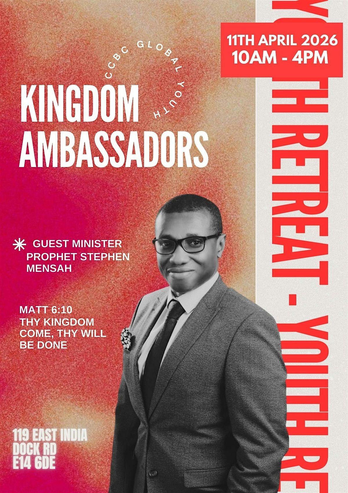 Join us for the KINGDOM AMBASSADORS RETREAT at 119 E India Dock Rd on April 11, 2026 at 10:00 AM (BST). It will be a powerful day packe with different insightful sessions on representing God. Inspired by Matthew 6:10, you will leave with a clearer understanding on what it means for the will of God to be done and for His kingdom to come. You will be equipped, helped, empowered and leave as a kingdom ambassador. Come expectant, brig a notepad and pen and be sure to invite a friend. We can't wait to welcome you!