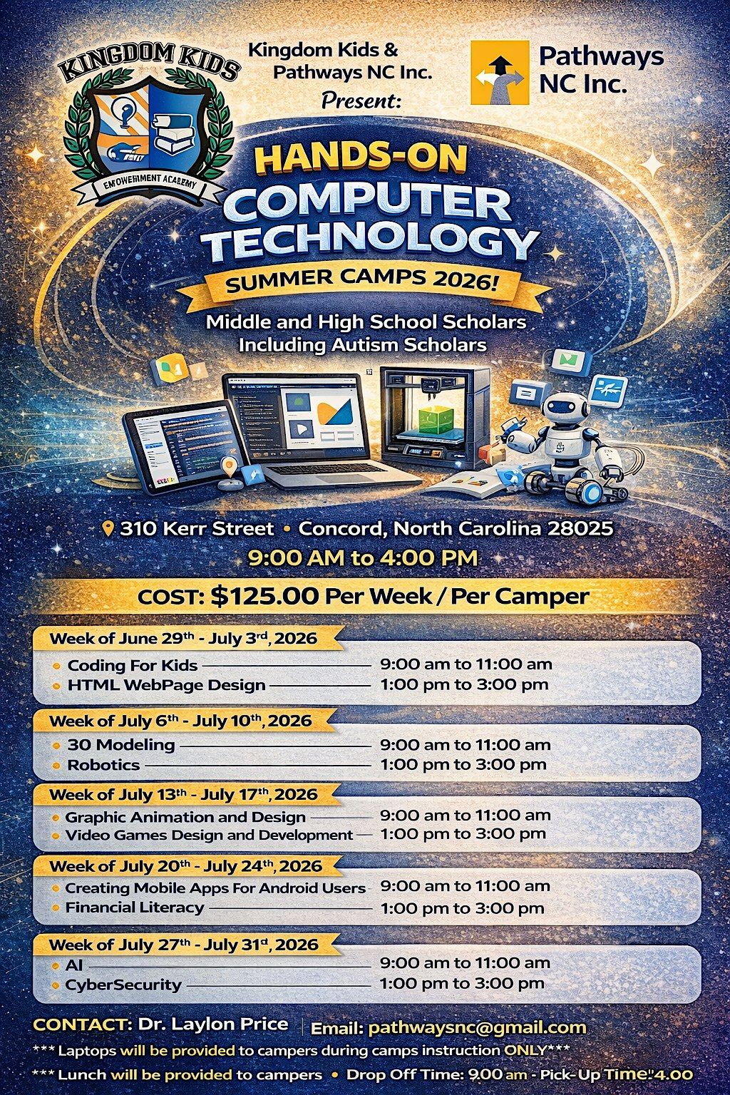 What: Kingdom Kids and Pathways NC Inc. "HANDS-ON" Computer Technology Summer Camps 2026 For Middle and High School Scholars Including Autism Scholars in Concord, North Carolina!