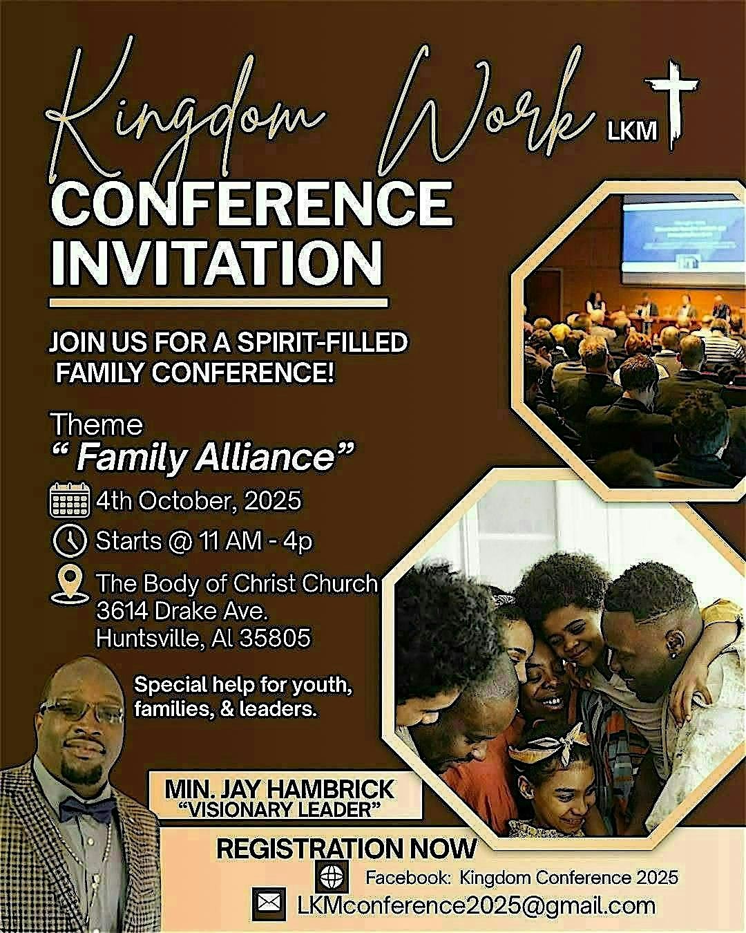 Welcome to the Kingdom Works Conference 2025! Join us at The Body of Christ Church in Huntsville, AL for an amazing event filled with inspiring speakers, powerful worship, and transparent panelist.