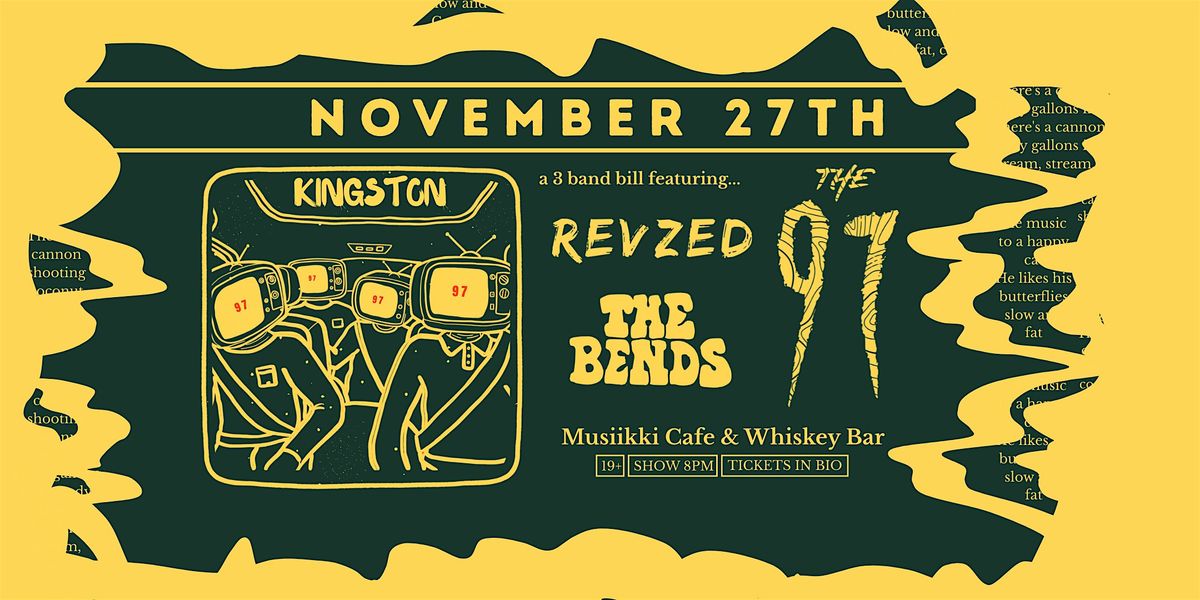 Get ready for a night of awesome live music at Musiikki Café & Whiskey Bar! Join us for performances by The Ninety Seven, RevZed, and The Bends. It's going to be a night to remember, filled with great tunes and good vibes. Don't miss out on this epic lineup in the heart of Kingston!