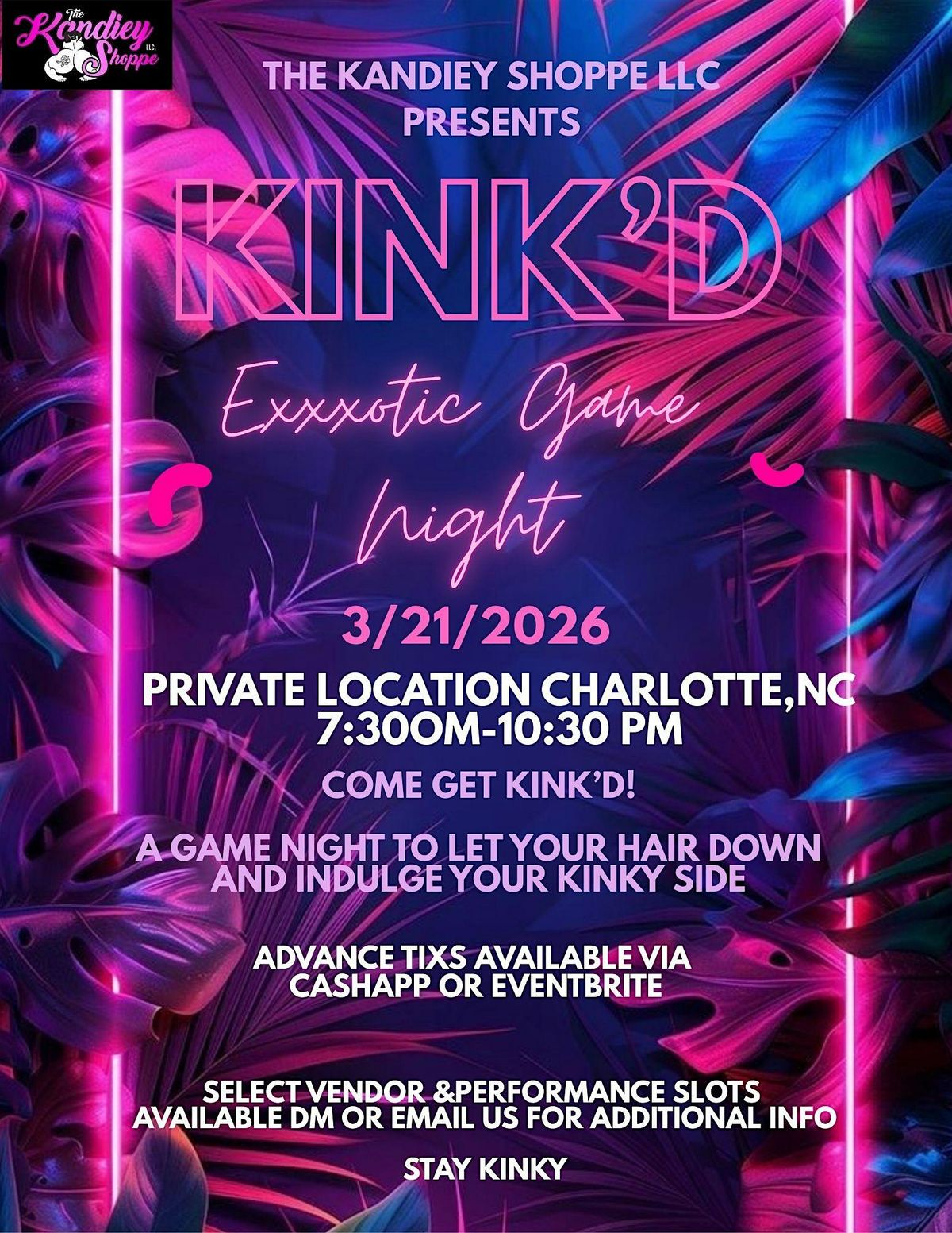 Welcome to KINKD EXXXOTIC GAME NIGHT! Get ready for a night of fun and excitement at Hilton Charlotte Airport. Join us on March 21, 2026 at 7:30 PM (Eastern Time) for a unique gaming experience like no other. Challenge your friends to thrilling games and enjoy a night filled with laughter and competition. Don't miss out on this unforgettable event!