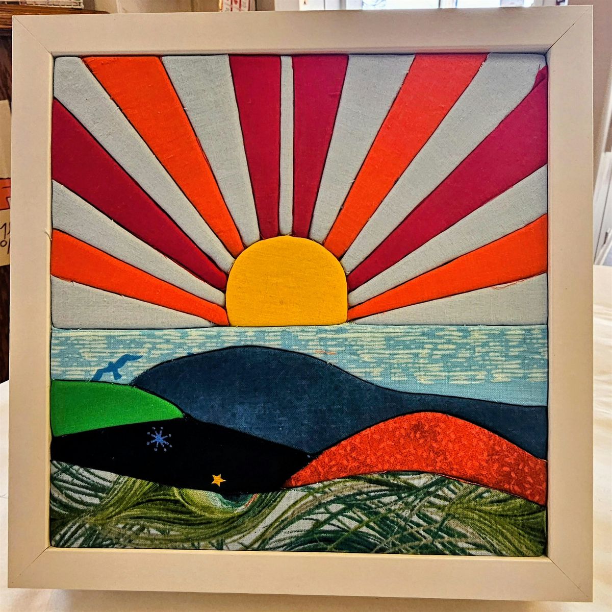 In this workshop you will learn how to use fabric to create stunning sunset. Your finish piece will be approximately 7.5 x 7.5 inches. This is a beginners workshop. You will need to bring an 8 x 8 shadow box for your finished piece. A limited number of 8 x 8 frames will be available for purchase the day of the workshop for $10 each. If you know you want a frame, call the studio ahead of time and reserve yours. The frames will be white as show in the picture.