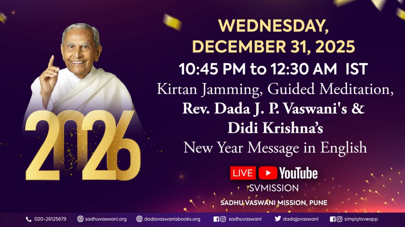 Step into the New Year with a heart full of peace, gratitude, and hope. As the New Year turns, immerse yourself in ecstatic kirtan jamming and guided meditation where voices, rhythms, and hearts come together as one. Recharge yourself with practical tips & roadmap for the New Year by Didi Krishna and Dada JP Vaswani, setting the tone for a positive and soulful beginning.