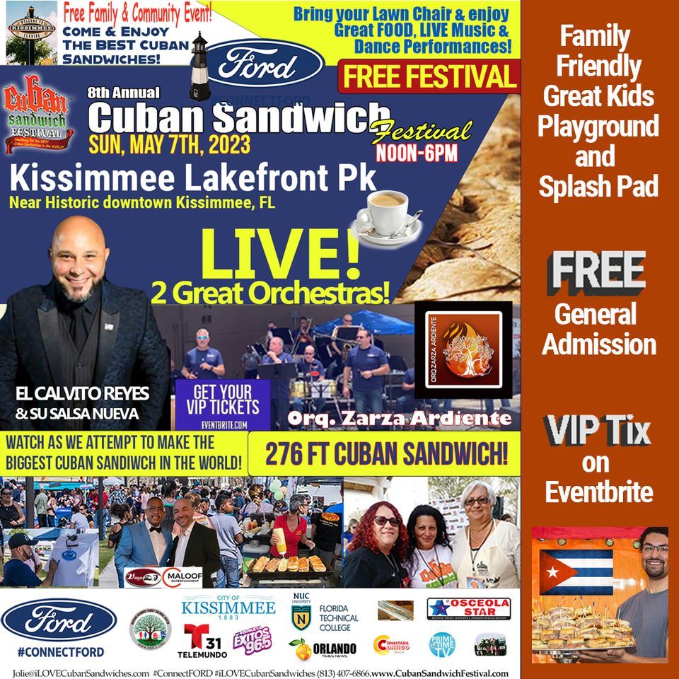 Back at KISSIMMEE LAKEFRONT PARK!8th Annual FORD Cuban Sandwich Festival of Kissimmee & Orlando / Central Florida is scheduled for Sunday, May 7th, 2023 in Kissimmee, FL 34742. 12 Noon-6pm
