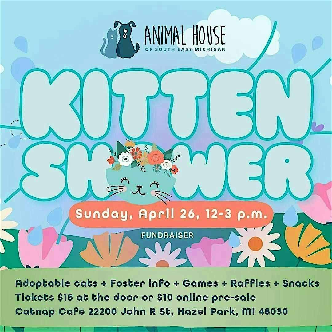 Join us on Sunday, April 26th for a Kitten Shower Fundraiser benefiting Animal House of South East Michigan! As kitten season begins, we are preparing for the many homeless kittens and cats who are already starting to come into our care.