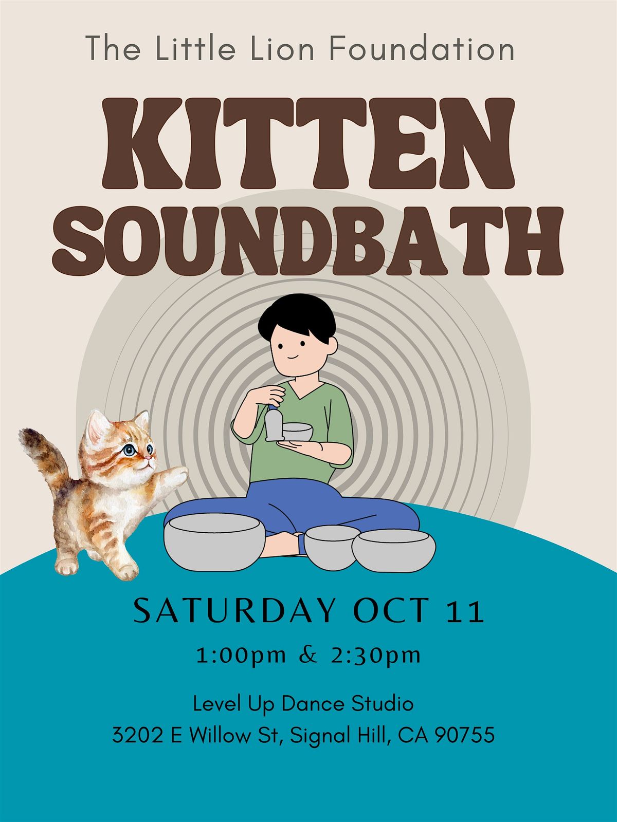☀️Join us for Kitten Soundbath!☀️ Relax and let the purrfect harmony of sound, meditation, and adorable rescue kittens whisk you away to a state of feline bliss. Your ticket purchase will be donated directly to The Little Lion Foundation cat rescue to pay the vet bills for sick and injured kittens.