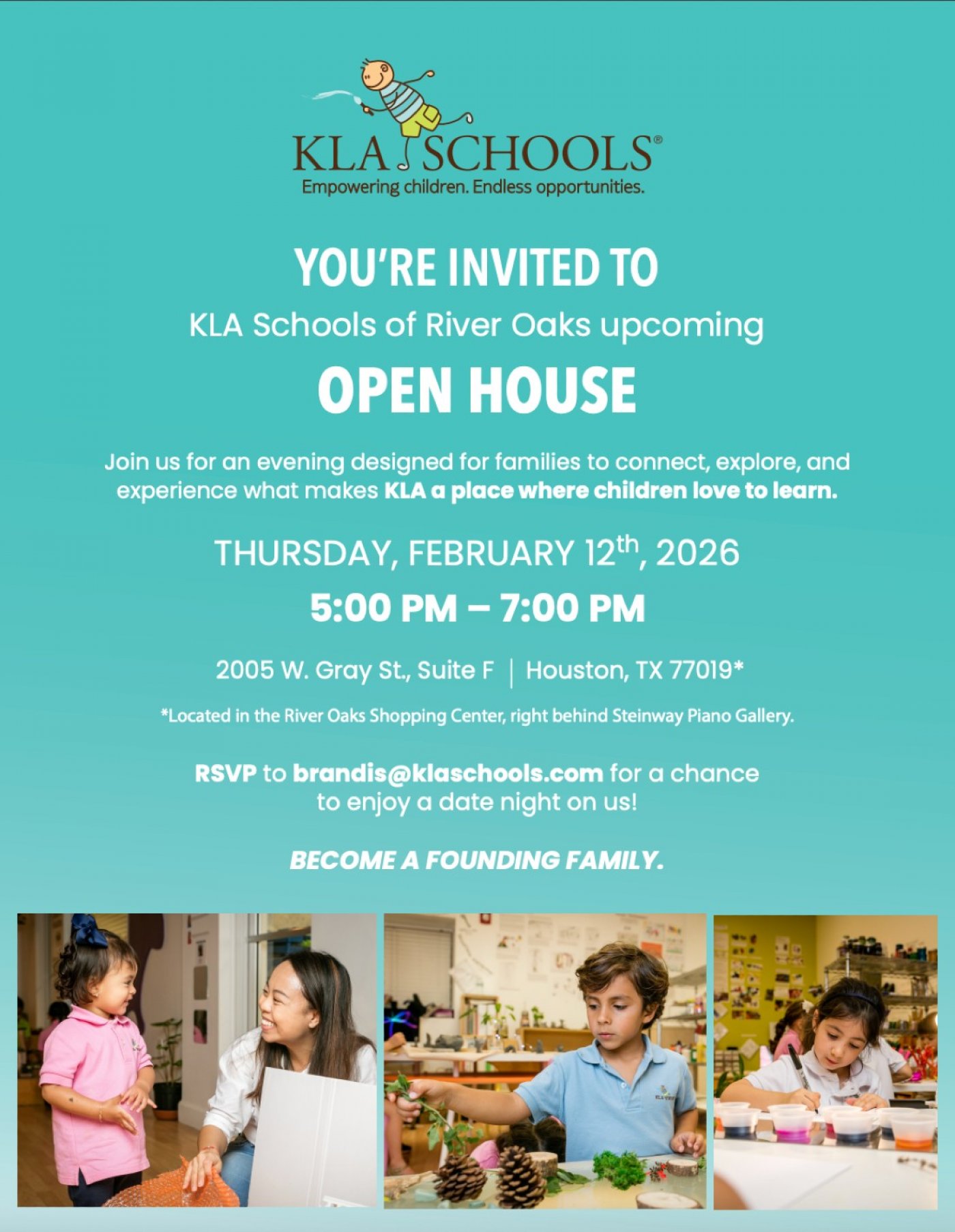 Join us for an evening designed for families to connect, explore, and experience what makes KLA a place where children love to learn. RSVP to [email protected] for a chance to enjoy a date night on us! Event is free.
