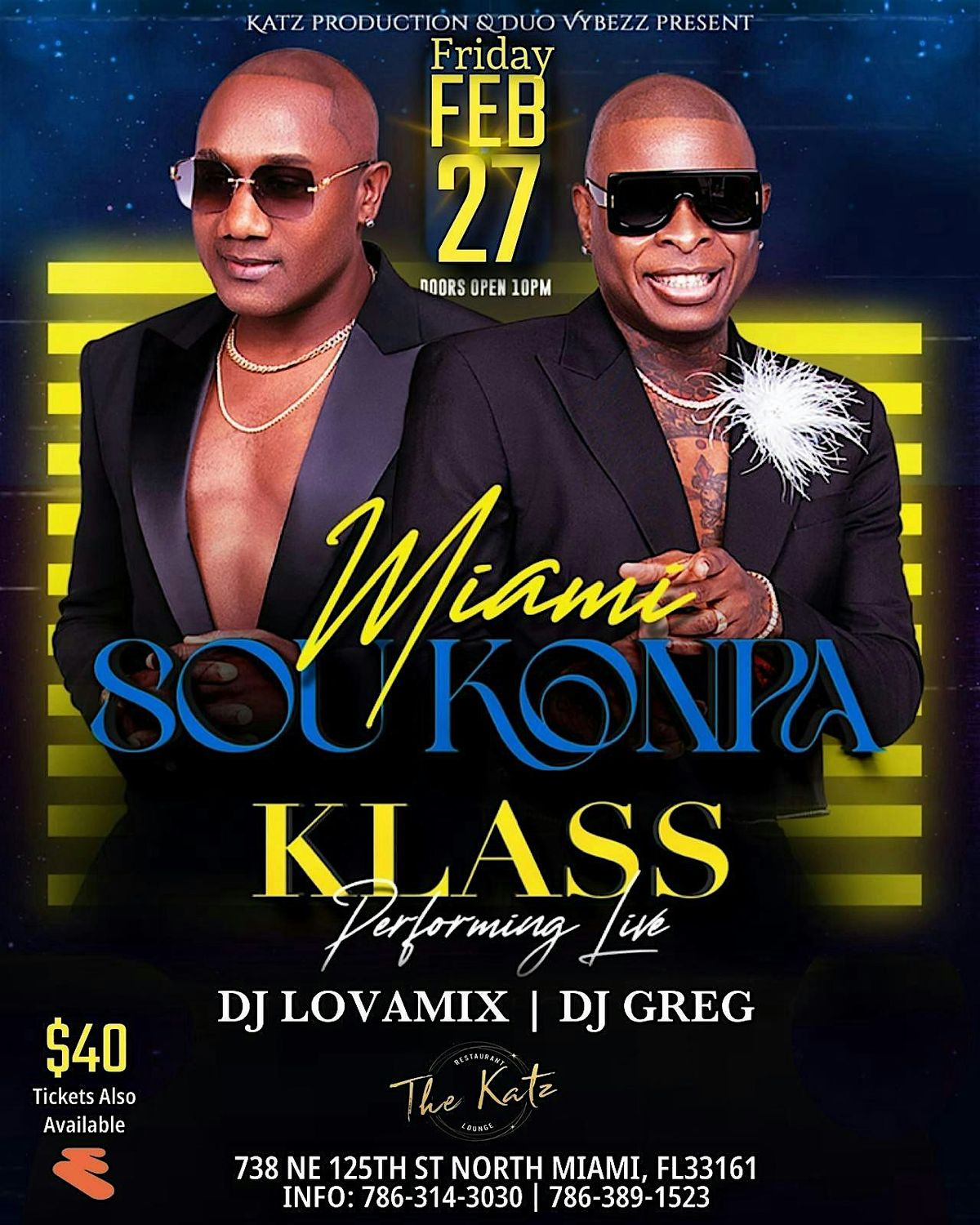 Come join us for a night filled with amazing music by KLASS at The Katz Restaurant and Lounge. Get ready to dance the night away on February 27, 2026 at 10:00 PM .. FREE PARKING !!! GREAT FOOD!!!