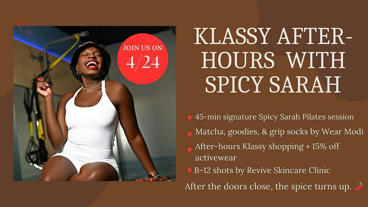 Klassy After Hours with Spicy Sarah is a high-energy, after-hours movement experience hosted inside Klassy designed to make you sweat, shake, and leave feeling HOT and strong. This is a 45-minute signature Spicy Sarah class blending strength and Pilates expect controlled burns, spicy transitions, and zero boring moments.