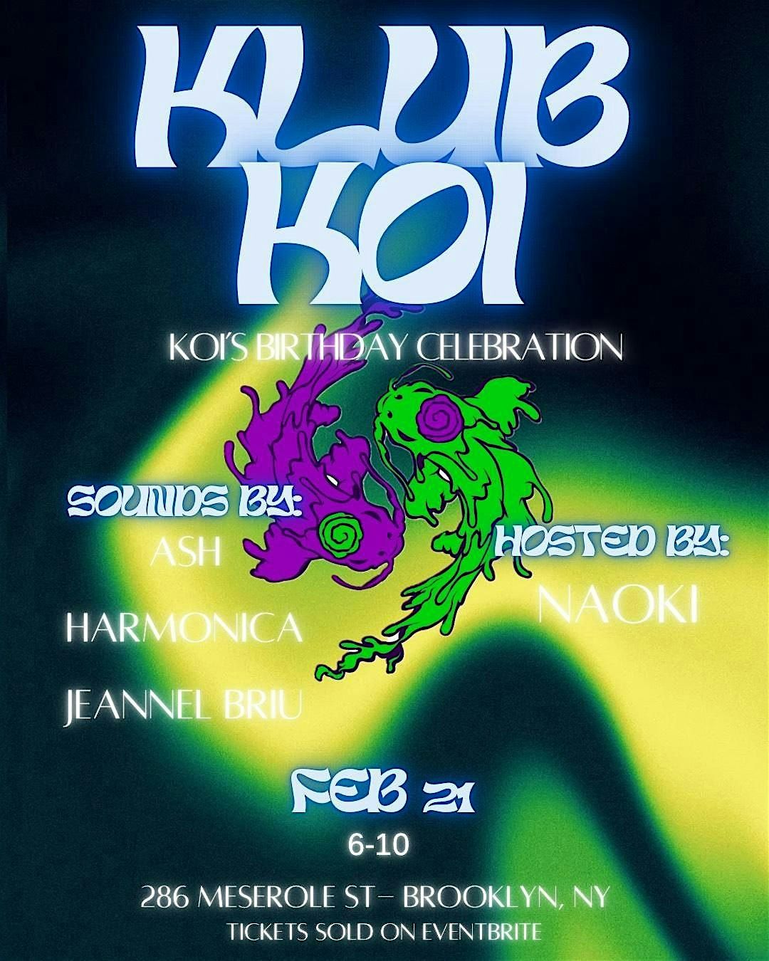 Come join us for KLUB KOI LIVE at 286 Meserole St! Get ready for a night of music, dancing, and good vibes. Our lineup features NYCs BEST FEMALE DJS that will keep you on your feet all night long. Don't miss out on this fire event - grab your friends and let's make some memories together. See you there!