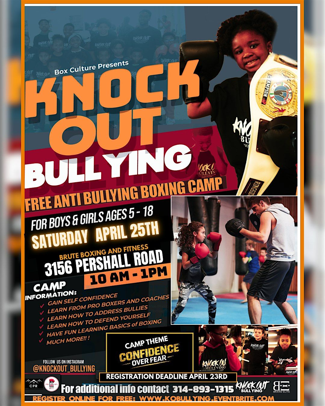 Don't miss this chance to be part of a community dedicated to eliminating bullying and building self esteem in our youth. Space is limited, so grab your spot now and let's knock out bullying together, one punch at a time! For general inquiries , registration and or to volunteer contact [314-893-1315]. #KnockoutBullying #Empowerment #BoxingForChange #CommunityStrong