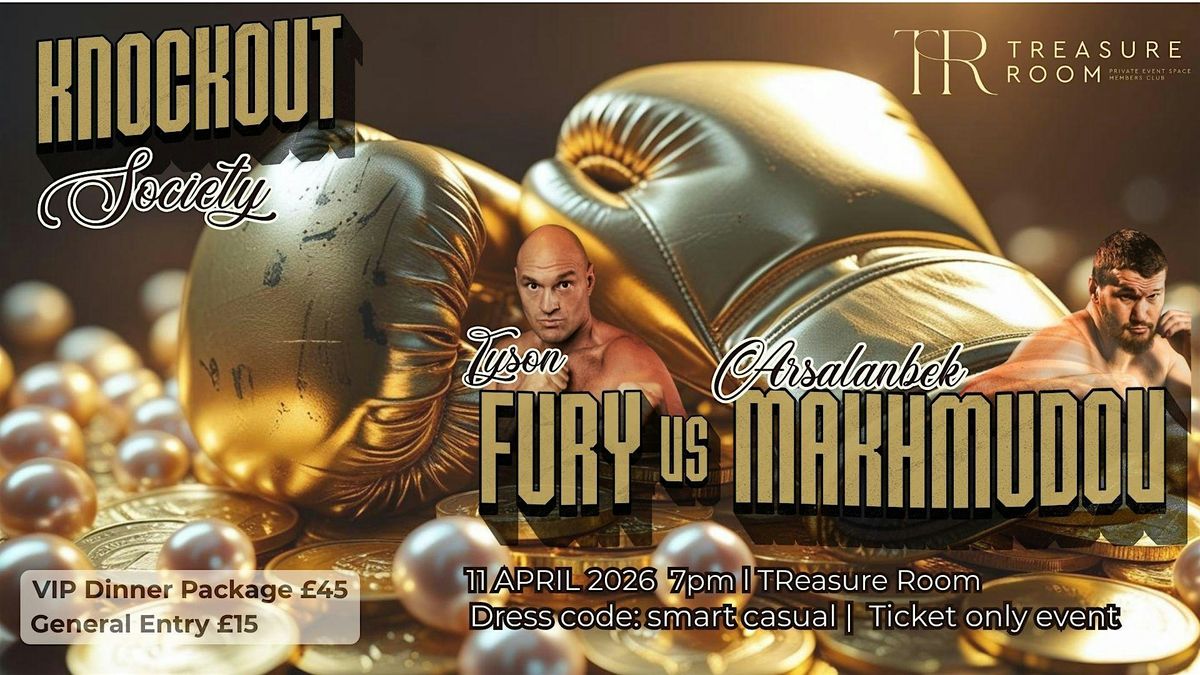 Get ready for an epic night with the Knockout Society! Join us at TReasure Room NW10 6EU on April 11, 2026 at 7:00 PM (BST) to view the highly anticipated clash between Fury & Makhmudov, & undercard Benn VS Progais.