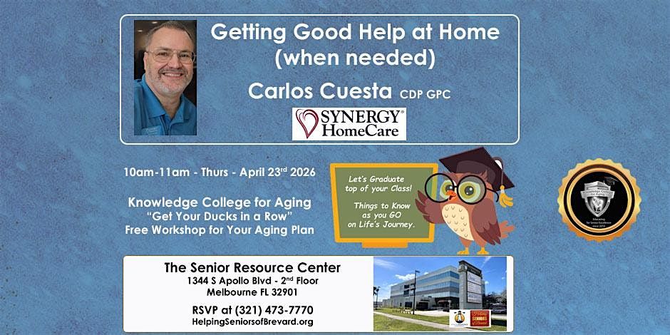 Info: Carlos Cuesta, Synergy HomeCare Brevard, shares on what we need to know when considering how Home Care fits into our Aging Plan. It's all about "Getting Your Ducks in a Row!"