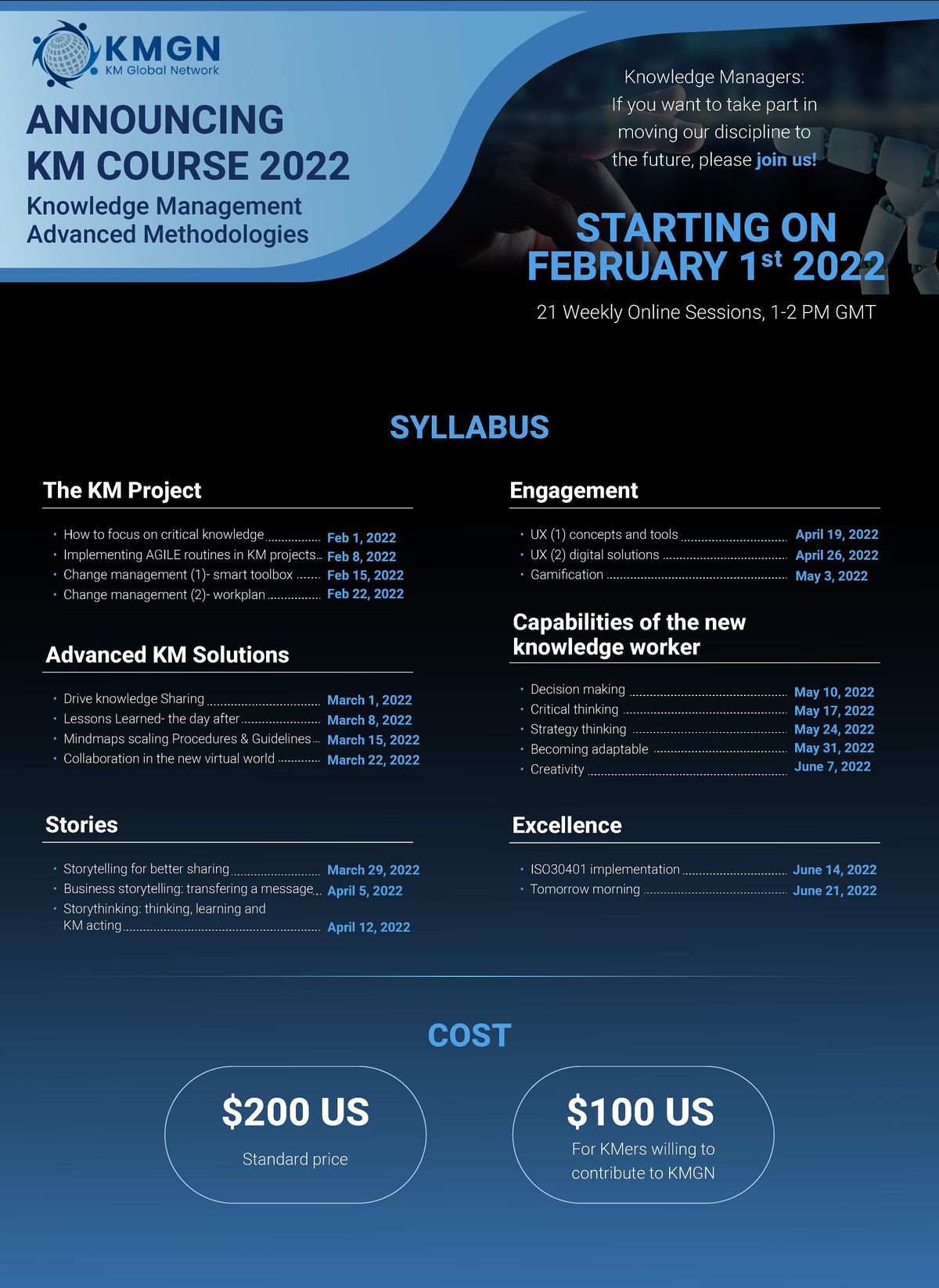 Gain access to 21 weekly online sessions starting from 1 Feb 2022. Topics covered include: