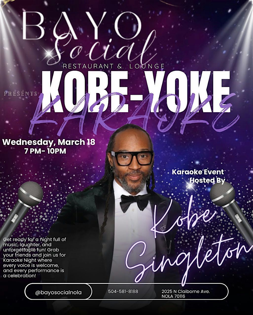 Kobe Yoke Karaoke is a karaoke event hosted by Kobe Singleton, created for a grown, sexy, and mature crowd looking to enjoy a fun atmosphereAgenda