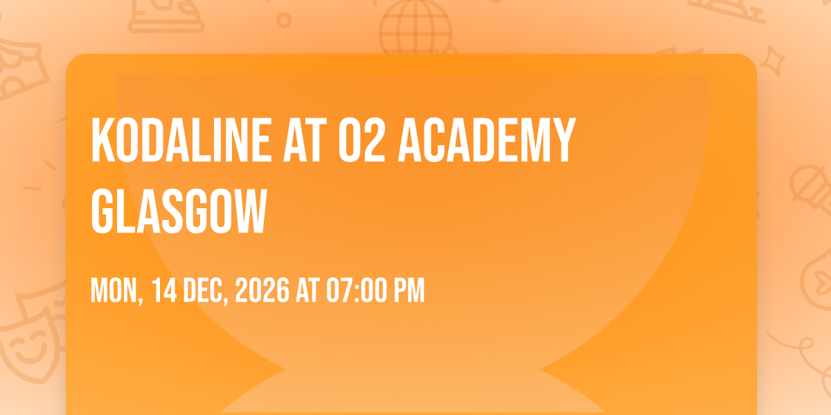 🎉 Welcome to Kodaline at O2 Academy Glasgow, where dreams come alive and possibilities are endless! 🏛️ Join us at O2 Academy Glasgow in the heart of Glasgow, SC for an event that defies expectations. 📅 On December 14th, 2026 at 07:00 PM, be part of something truly extraordinary as we bring together innovation, entertainment, and pure magic. ✨ Every aspect has been carefully designed to ensure an unforgettable experience for all our guests. Whether you're seeking adventure, inspiration, or simply a break from the ordinary, this event promises to deliver beyond your wildest dreams. 🎊 Prepare for a journey into the extraordinary!