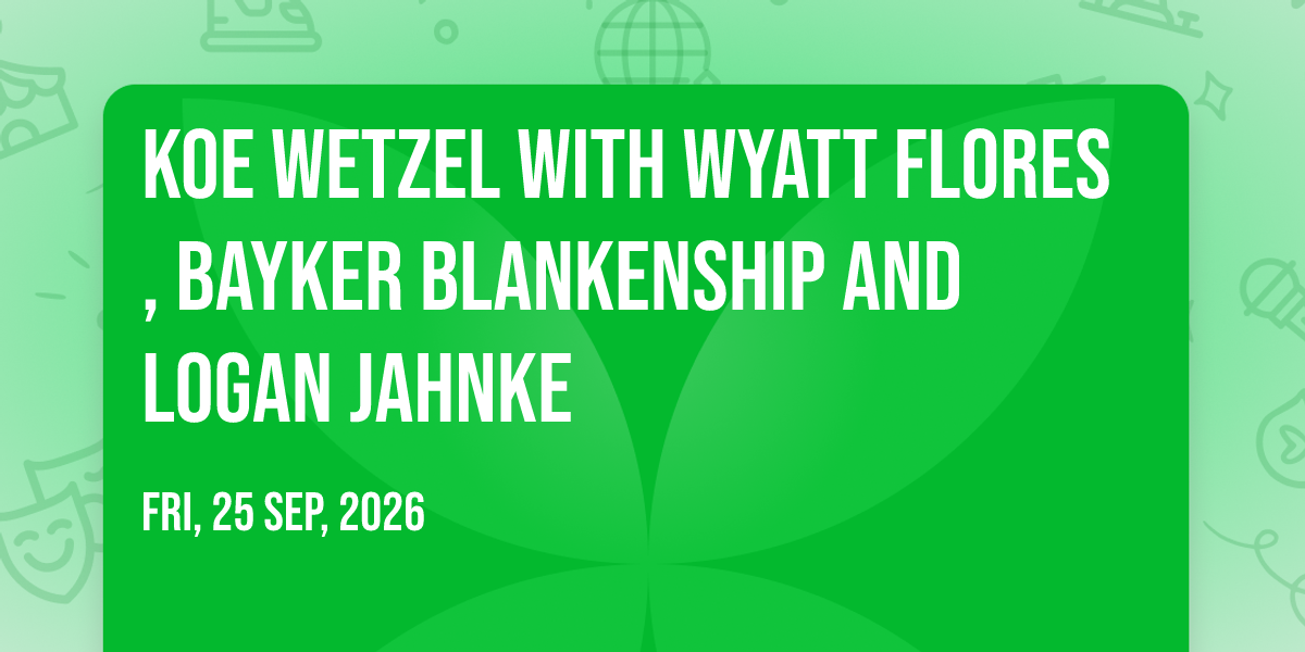 📍 Location: 34.7343, -86.668🌟 Step into a world of wonder at Koe Wetzel with Wyatt Flores, Bayker Blankenship and Logan Jahnke, where extraordinary moments await! 🏛️ Located at Orion Amphitheater in dynamic Huntsville, AL, this event will become the talk of the town. 📅 Join us on September 25th, 2026 at 11:45 PM for a celebration that defies the ordinary. ✨ This curated experience brings together the best of entertainment, culture, and community spirit. Every detail has been thoughtfully planned to ensure an unforgettable experience for all our guests. 🎯 Take advantage of this opportunity to be part of something special. 🎊 Early registration is recommended as space is limited!