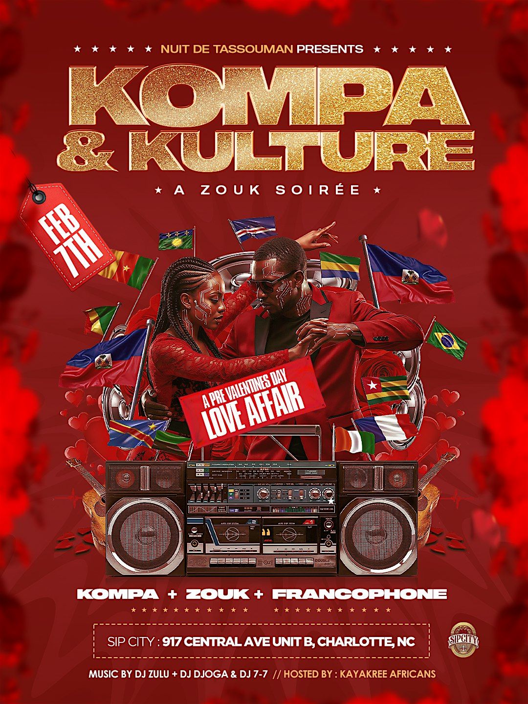 Designed as a “Love Affair” pre-Valentine’s vibe, the event celebrates Afro-Caribbean unity, music, dance, and international culture. The atmosphere promises passion, elegance, and nonstop dancing, powered by DJ Zulu, DJ Djoga, and DJ 7-7, and hosted by Kayakree Africans.